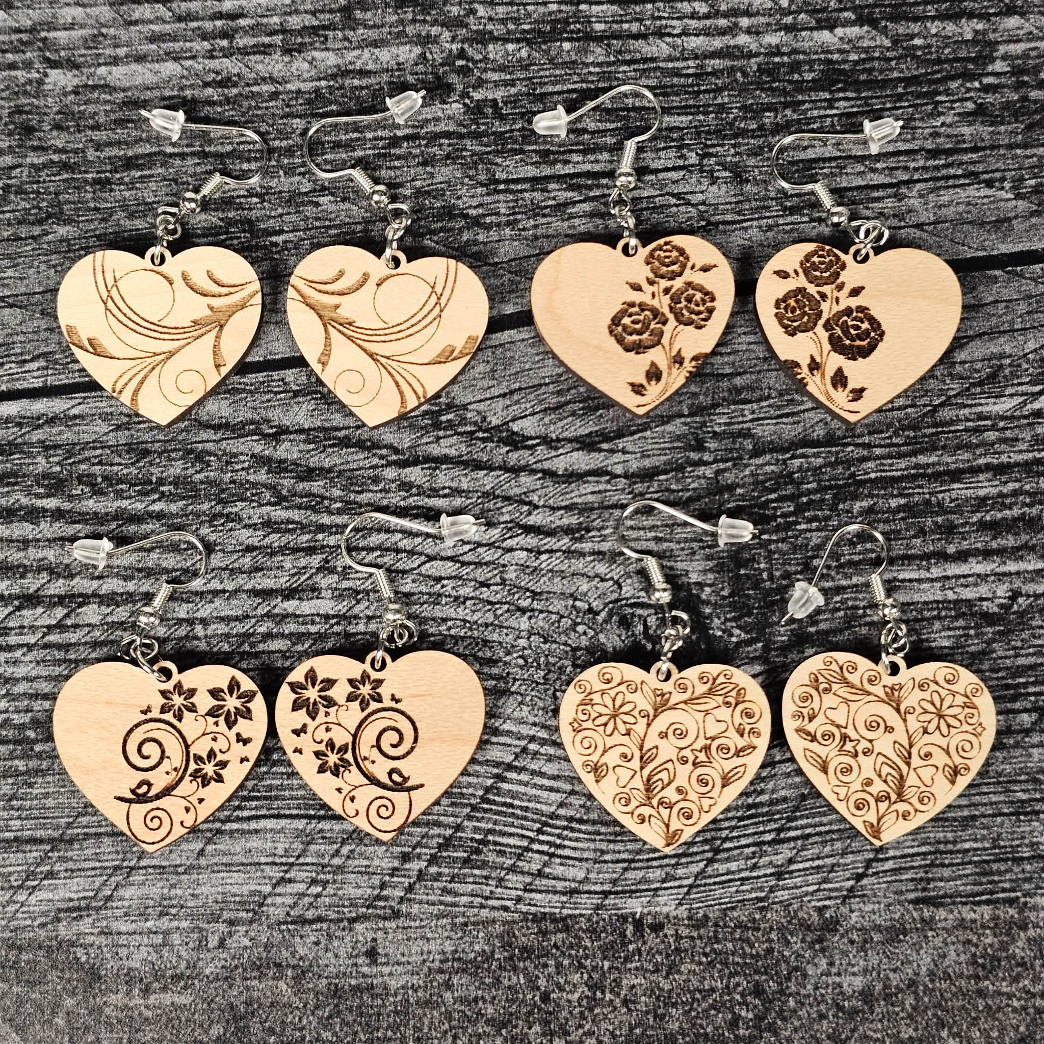 These are laser cut/engraved out of wood then finished with silver fish hook settings and silicone backings.