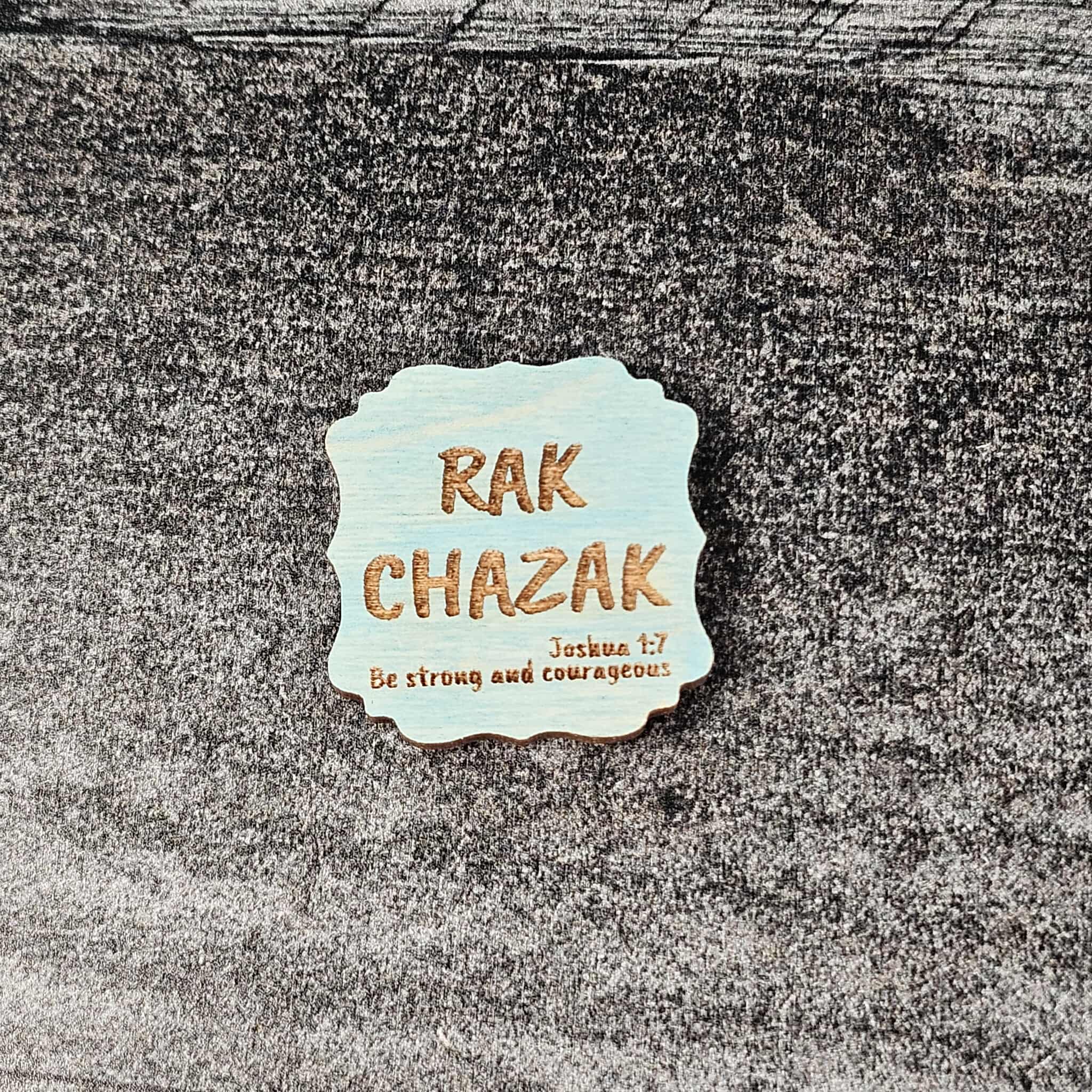 Decorative unstained wooden magnet with 'RAK CHAZAK' text, as well as a quote from Bible verse Joshua 1:7 on a textured surface.