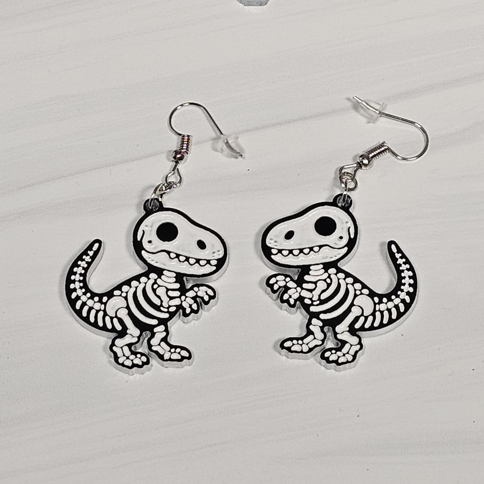 Add a touch of spooky cuteness to your Halloween look with these playful dangle earrings! Made from laser-cut and engraved acrylic, these festive earrings feature your favorite animals in adorable skeleton form. Each pair captures the spirit of the season in a fun and quirky way. Lightweight and comfortable, they’ll sway and dangle as you move, adding the perfect hint of Halloween charm to any outfit. Whether you’re headed to a costume party or just want to get into the spooky spirit, these earrings are the perfect accessory for all your ghostly gatherings! 🎃👻 These earrings have a silver fish hook setting with a silicone backing.