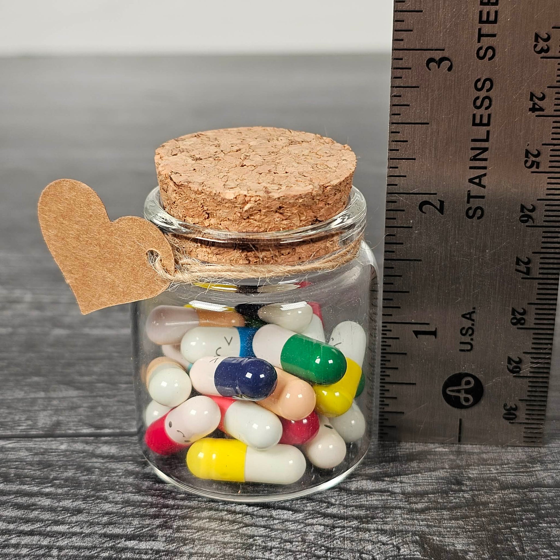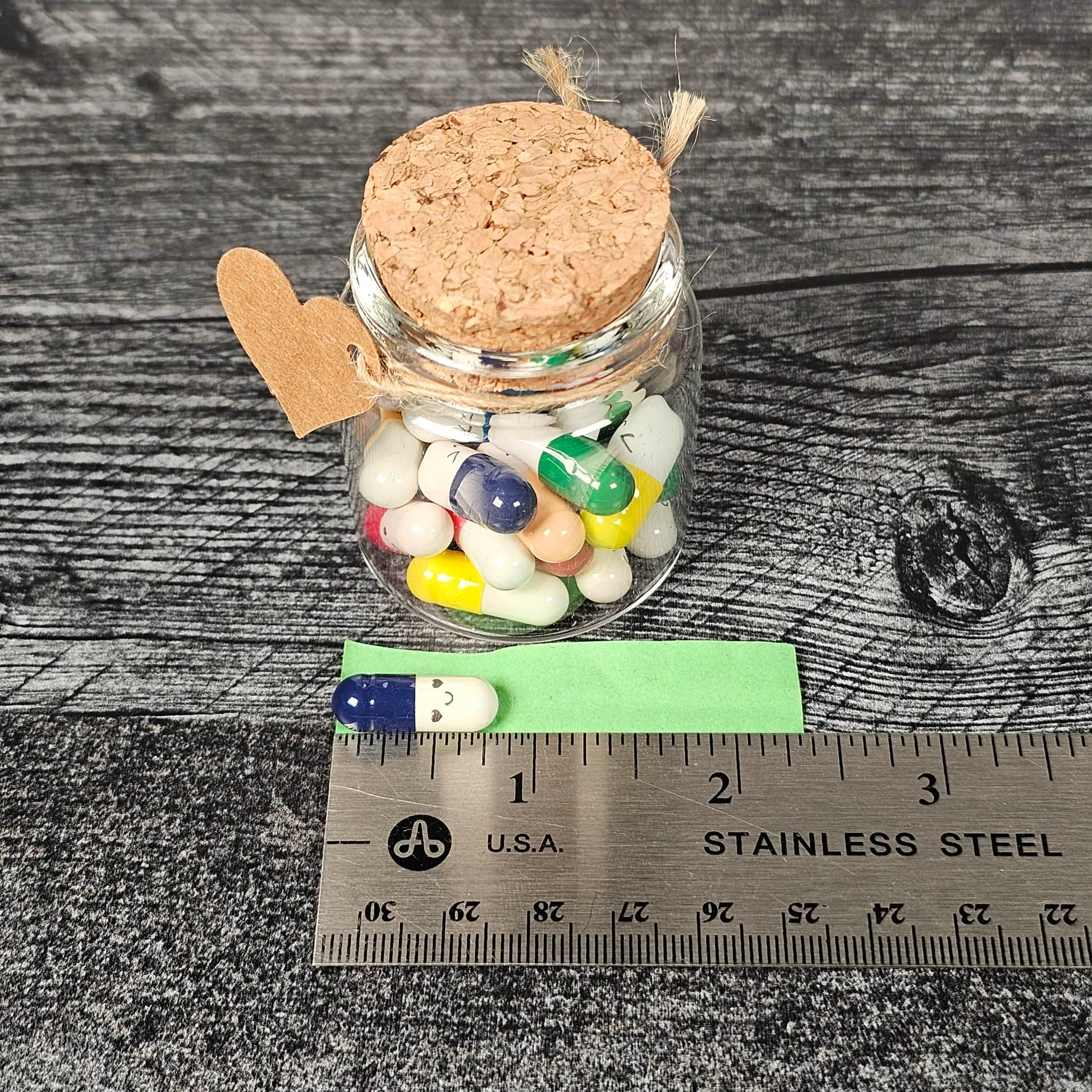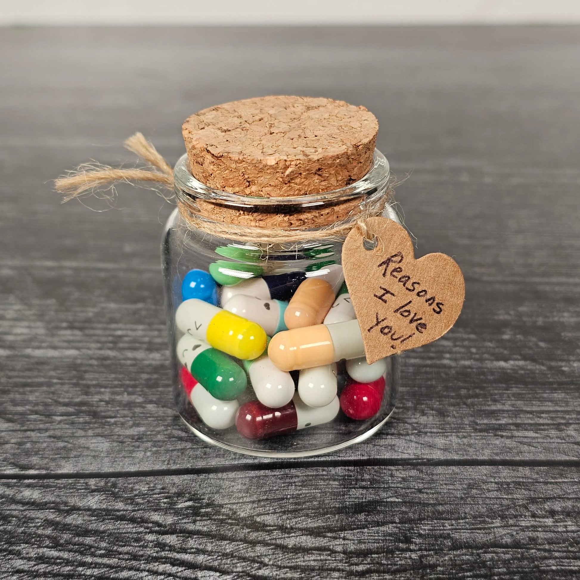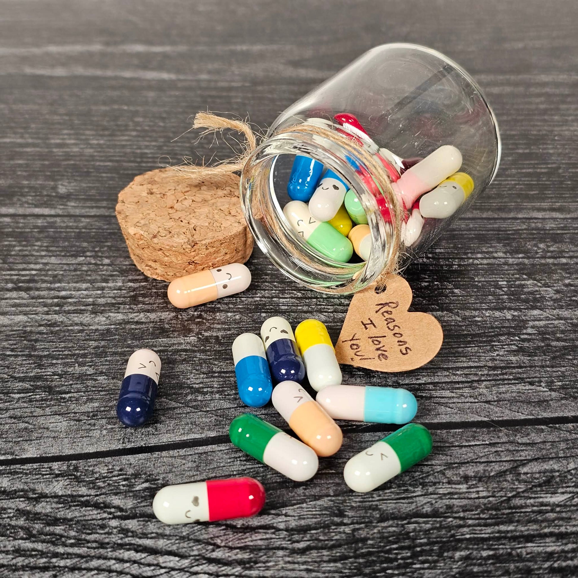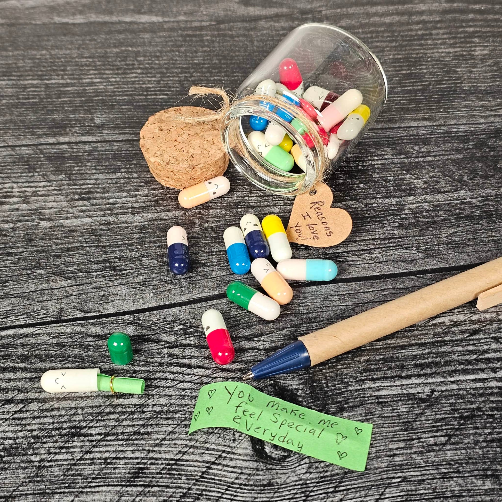 This glass bottle contains 25 pill capsules each with a small piece of paper rolled up inside. The idea is for you to write a note on each one to your special someone.