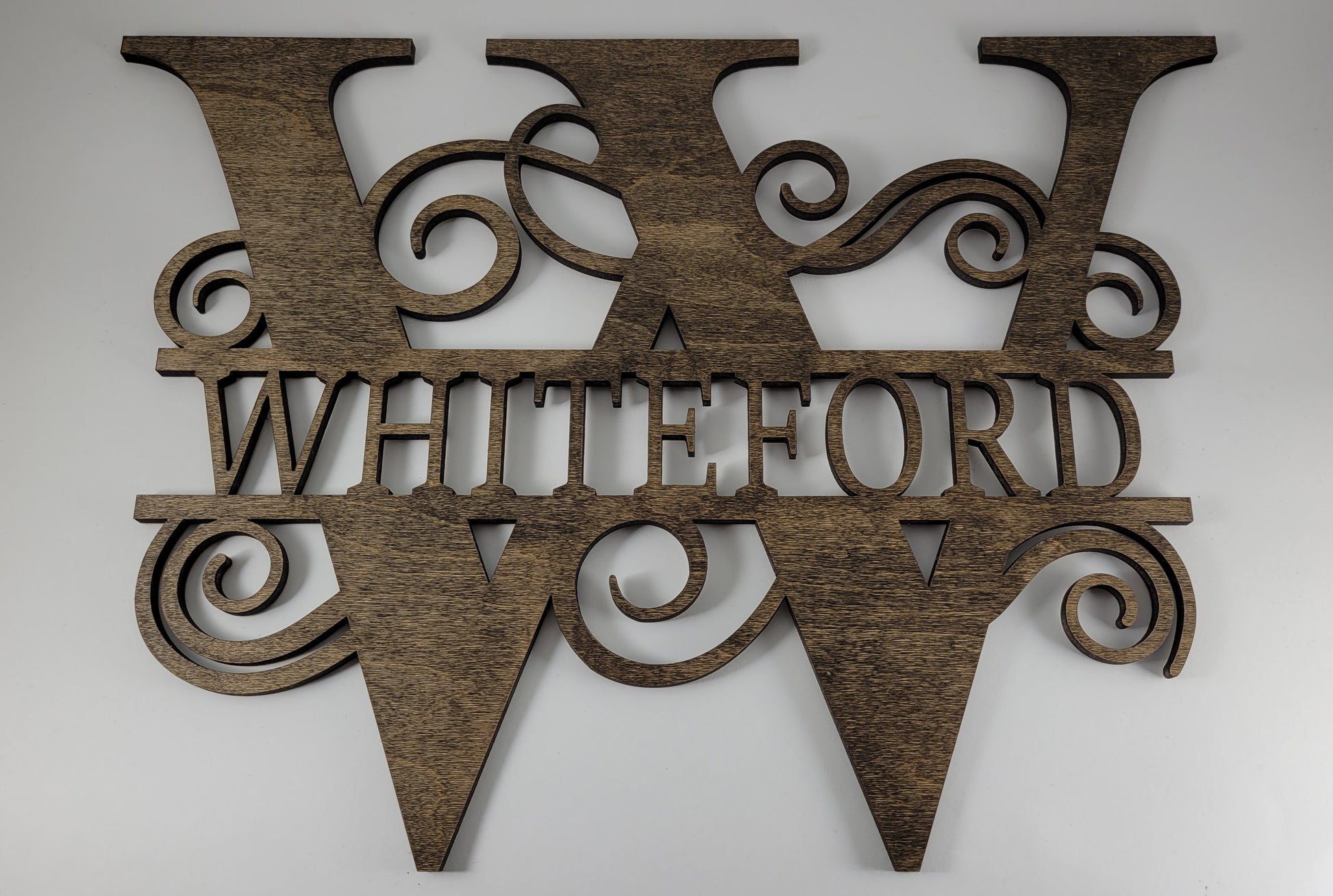 These split letter, swirly monograms and a beautiful way to display your family pride! They are perfect as wall hangers or shelf/mantel pieces.