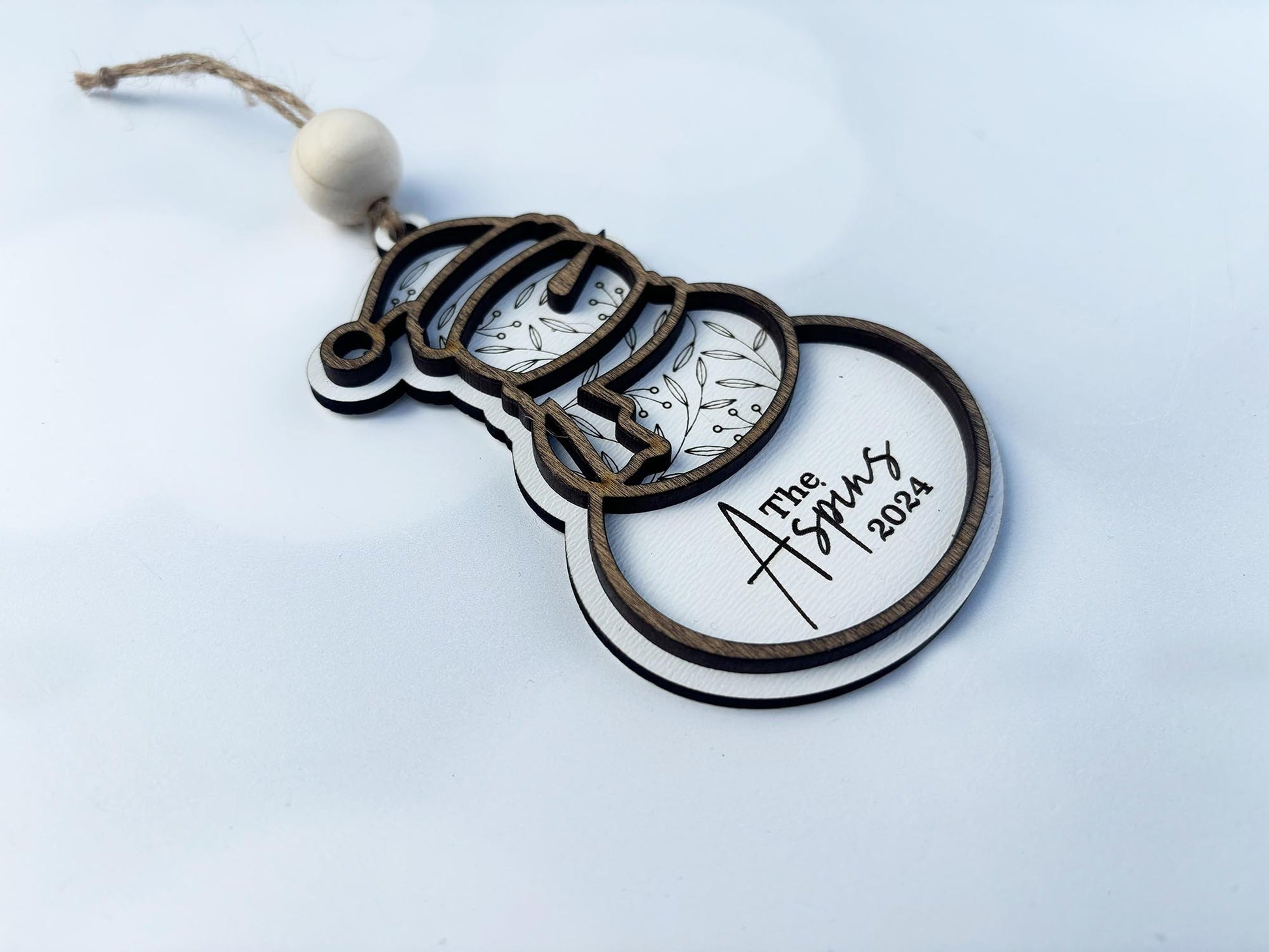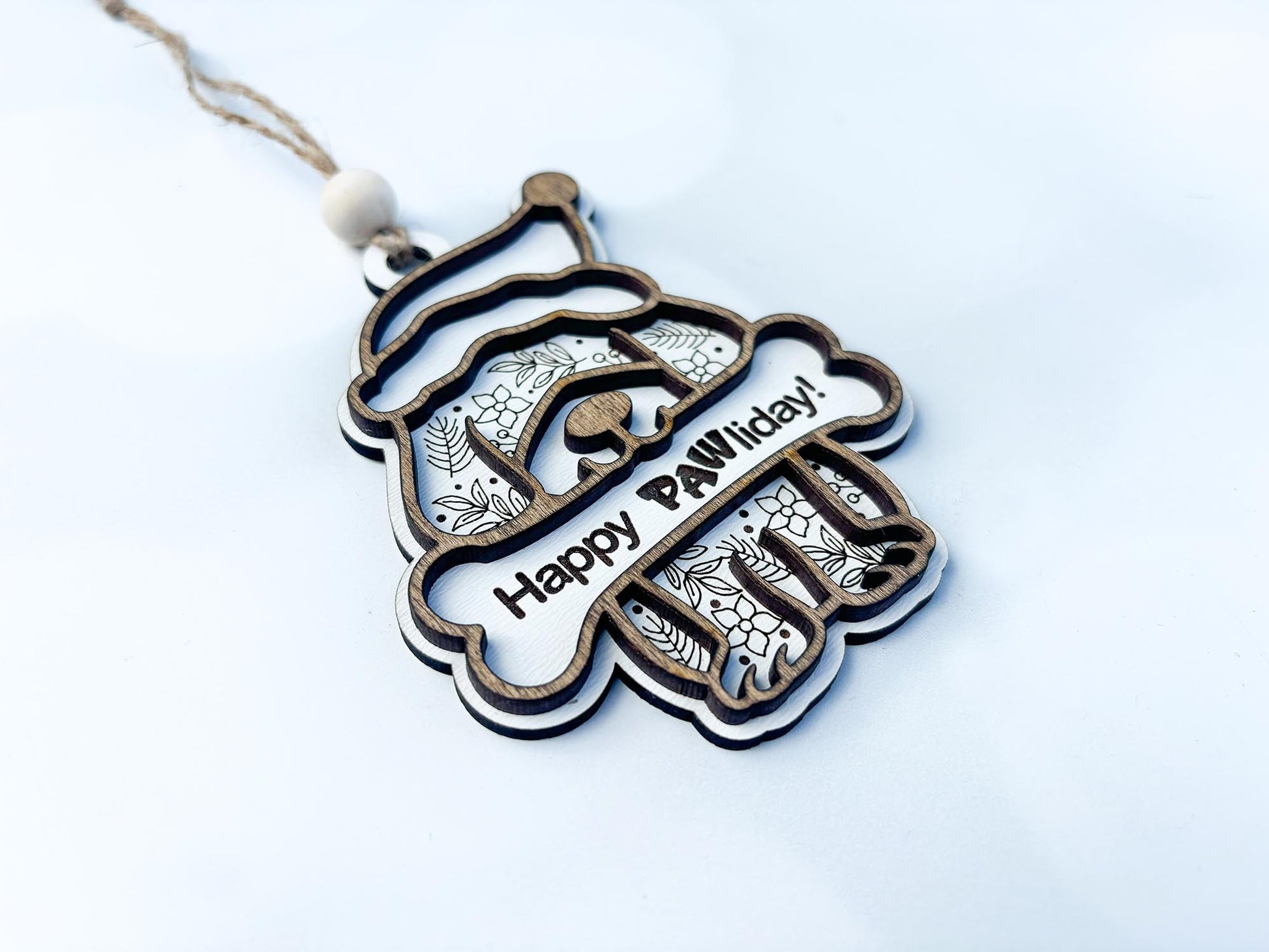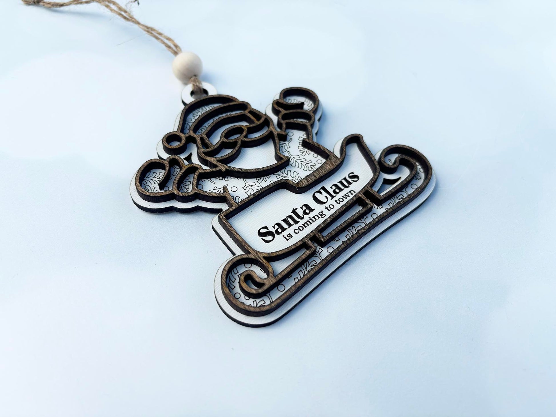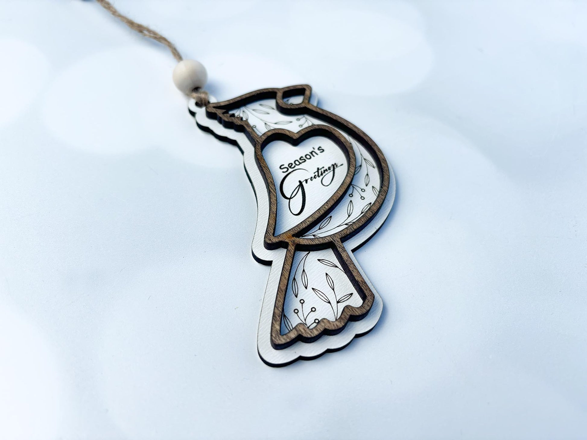 Celebrate the magic of the season with these timeless, handcrafted laser-cut wooden ornaments. Each ornament features a two-layered design: a white base adorned with intricate, swirly holiday-themed patterns and festive phrases, topped with a rich dark walnut-stained layer that beautifully contrasts against the white.