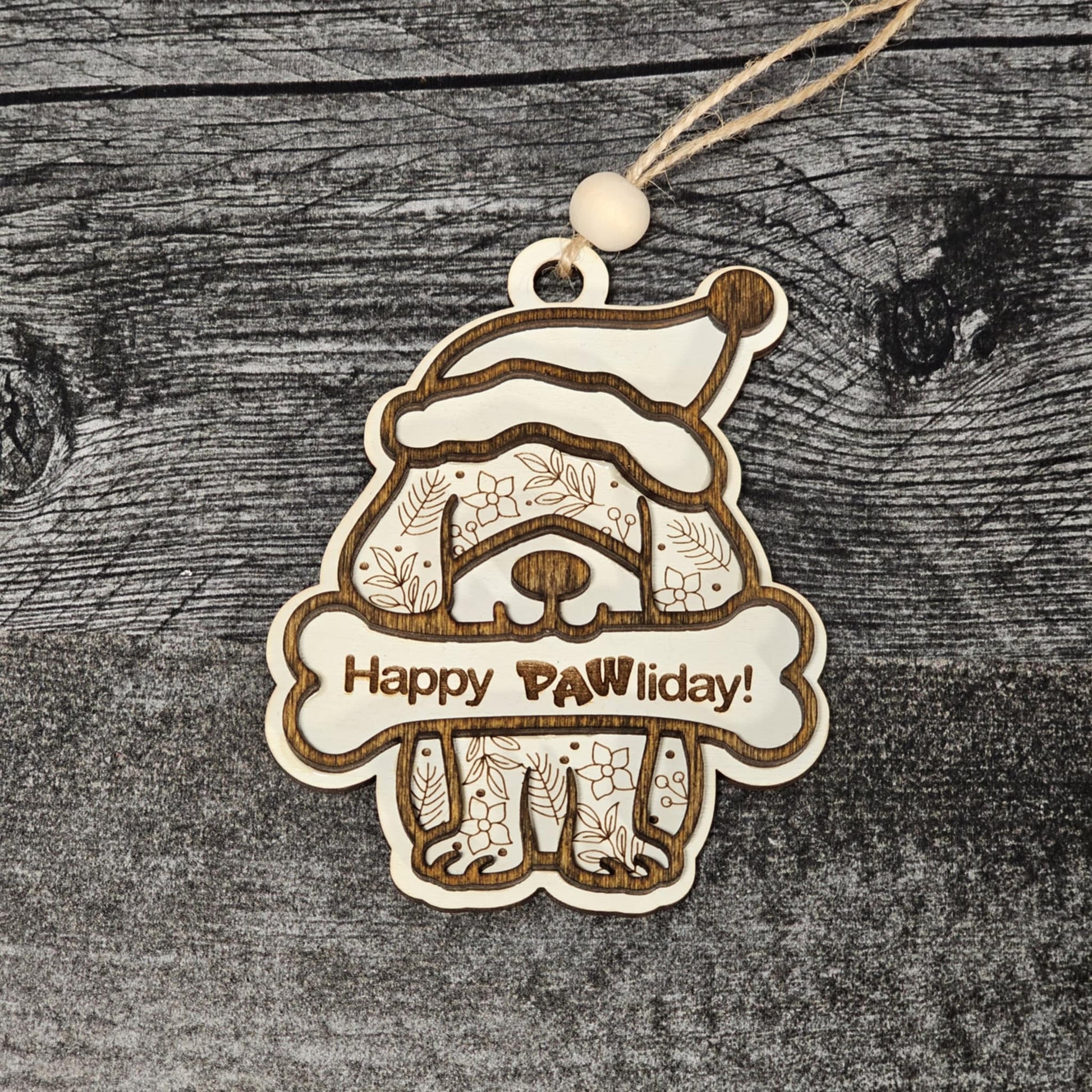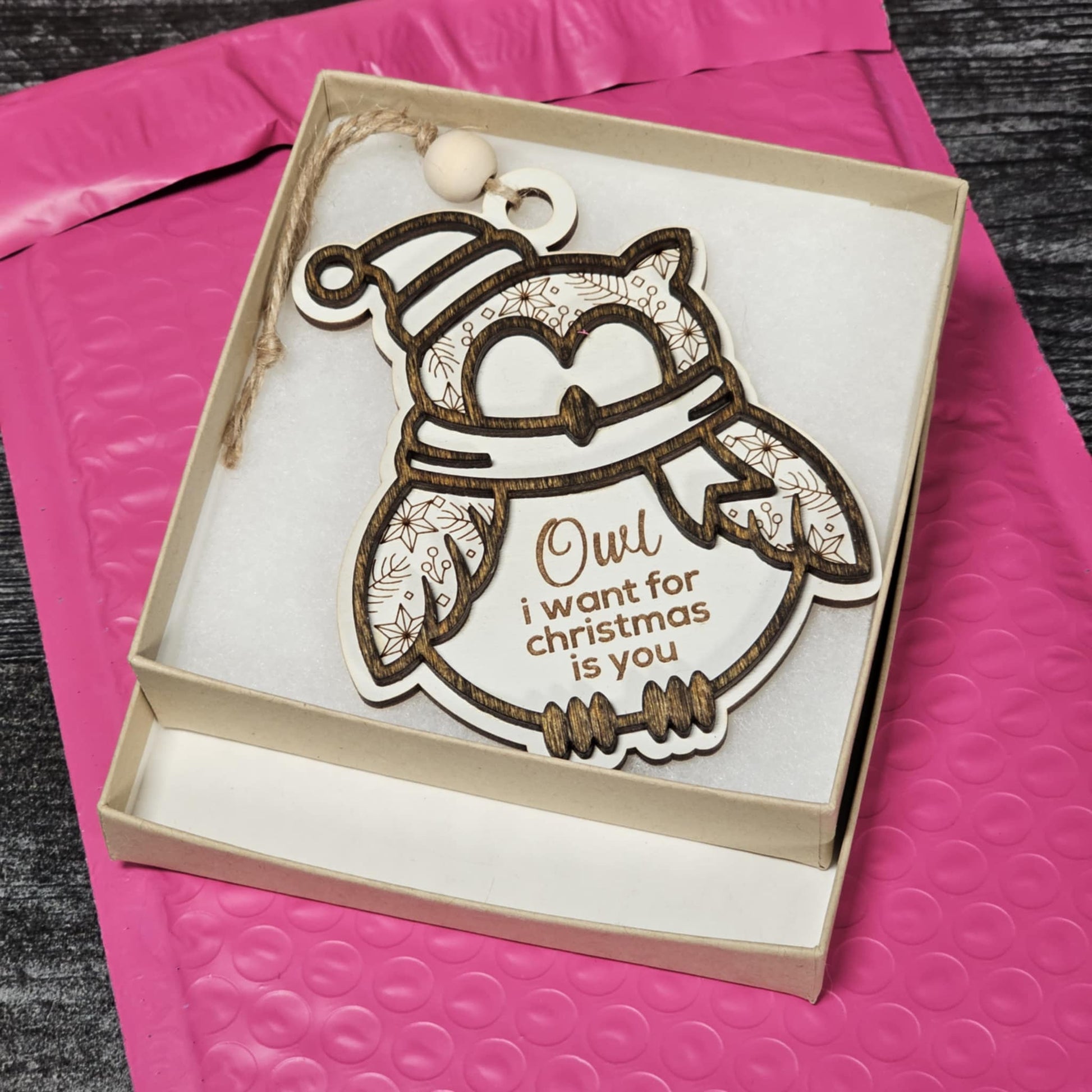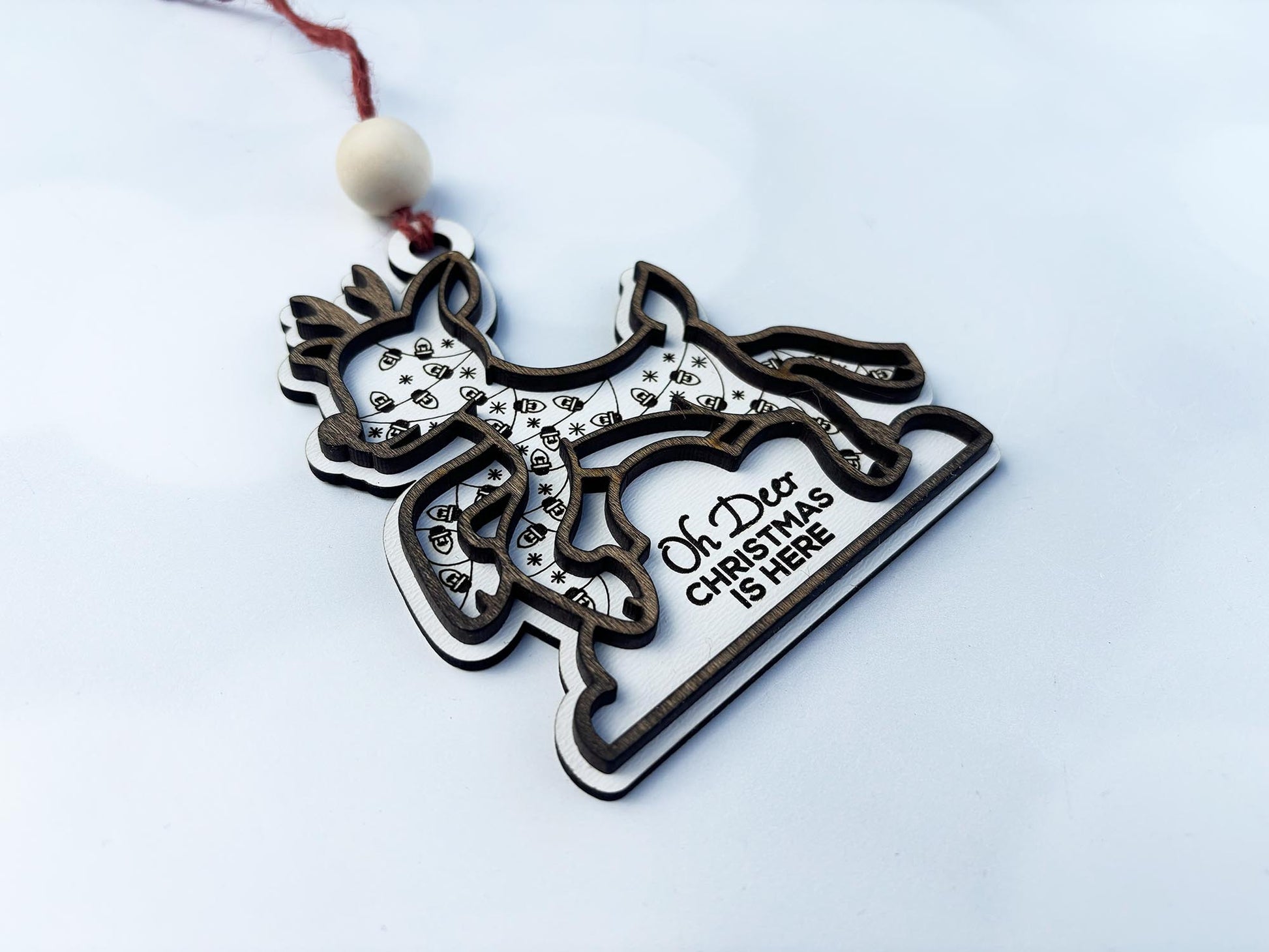 Celebrate the magic of the season with these timeless, handcrafted laser-cut wooden ornaments. Each ornament features a two-layered design: a white base adorned with intricate, swirly holiday-themed patterns and festive phrases, topped with a rich dark walnut-stained layer that beautifully contrasts against the white.