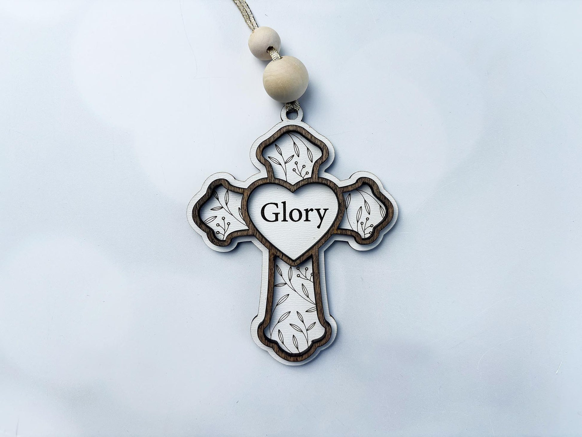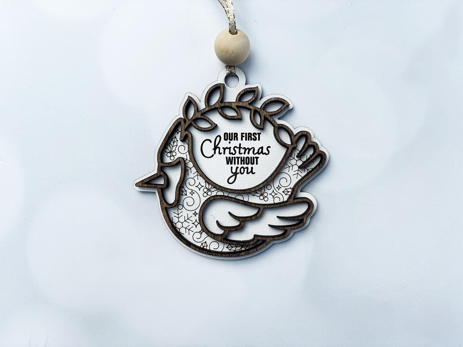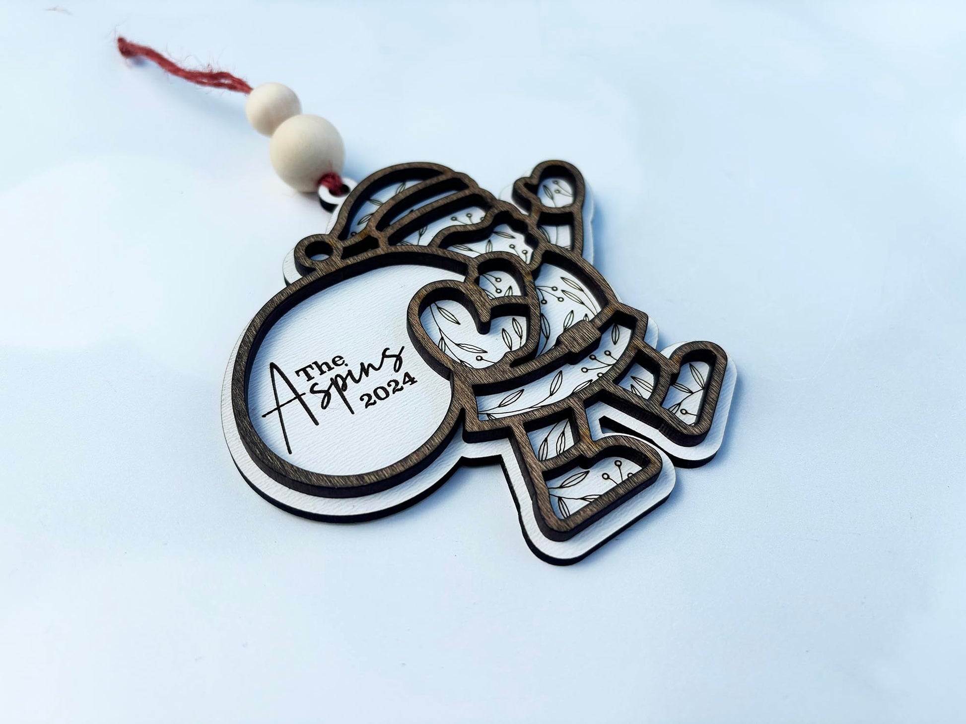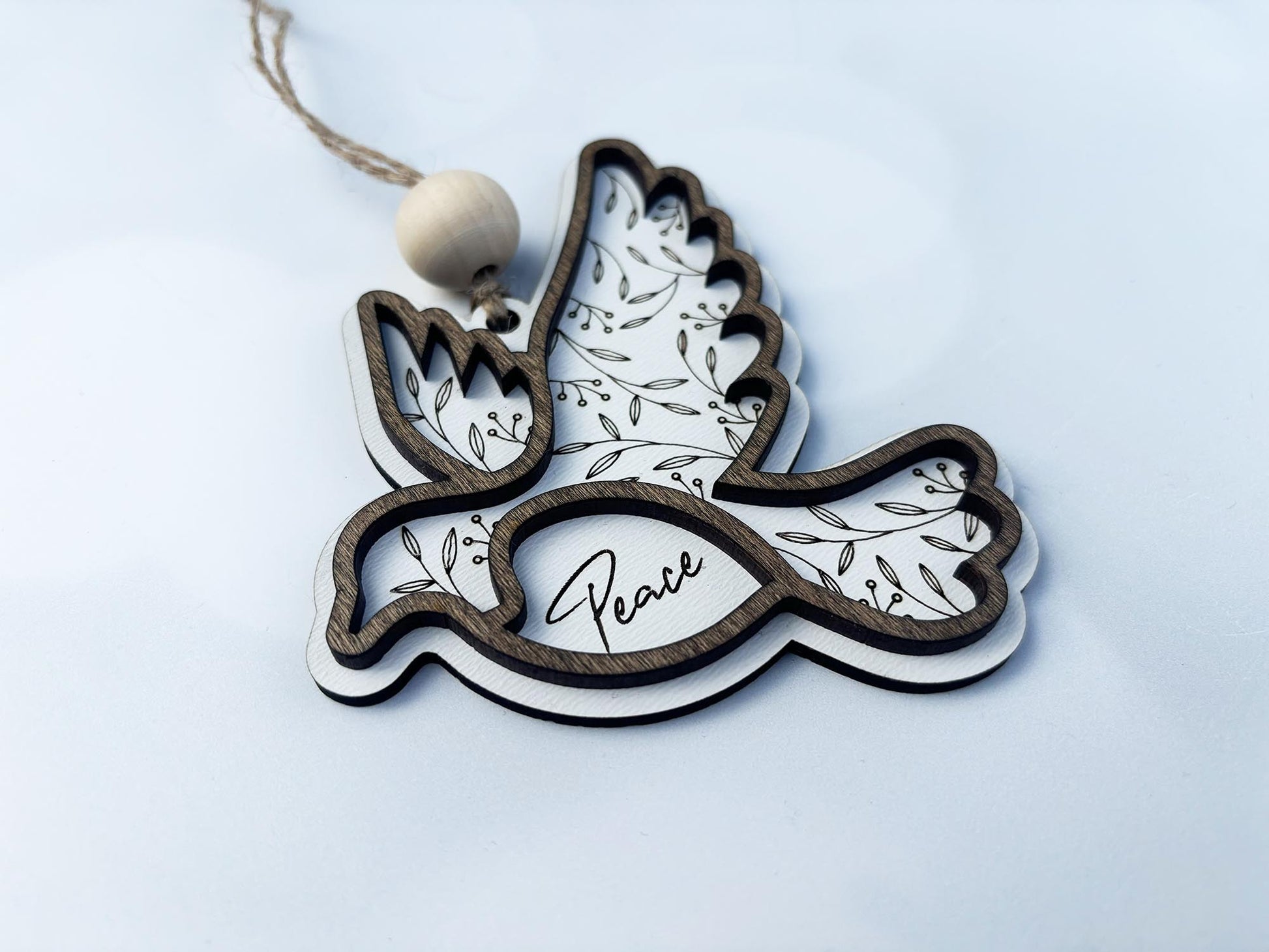 Celebrate the magic of the season with these timeless, handcrafted laser-cut wooden ornaments. Each ornament features a two-layered design: a white base adorned with intricate, swirly holiday-themed patterns and festive phrases, topped with a rich dark walnut-stained layer that beautifully contrasts against the white.