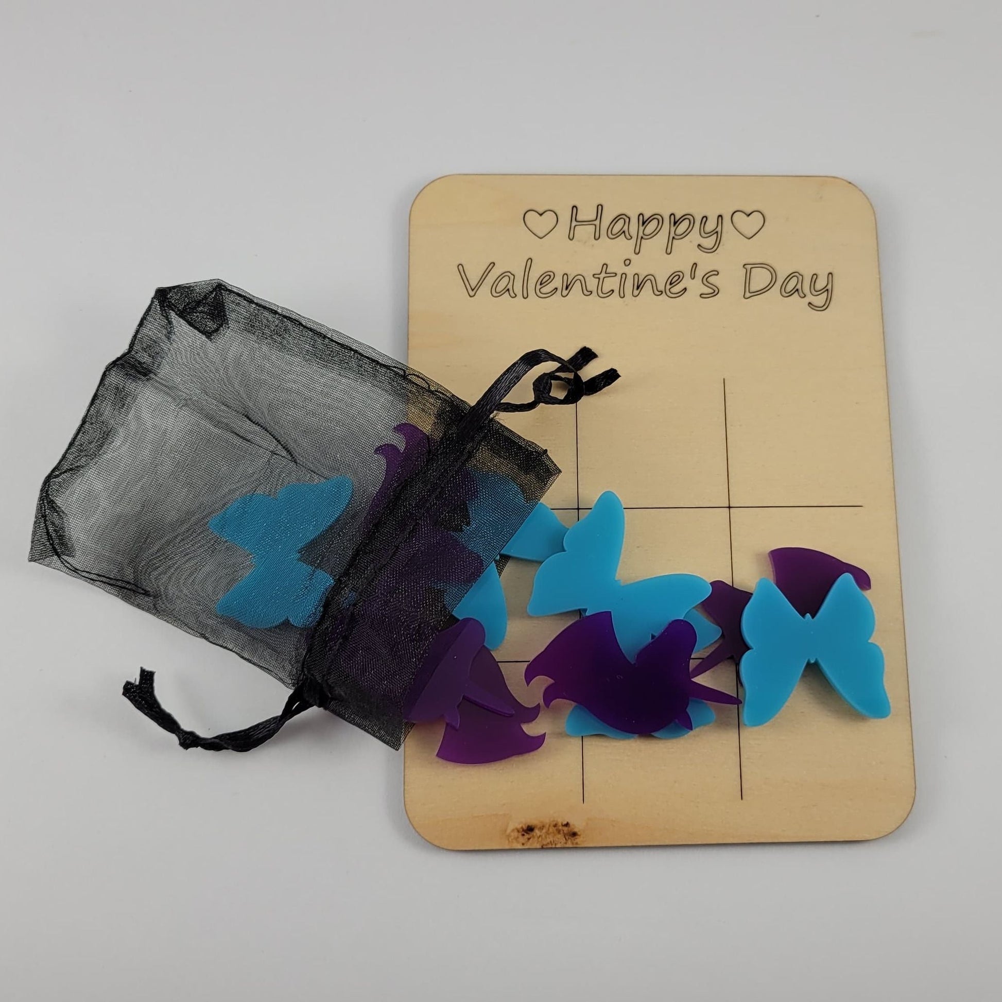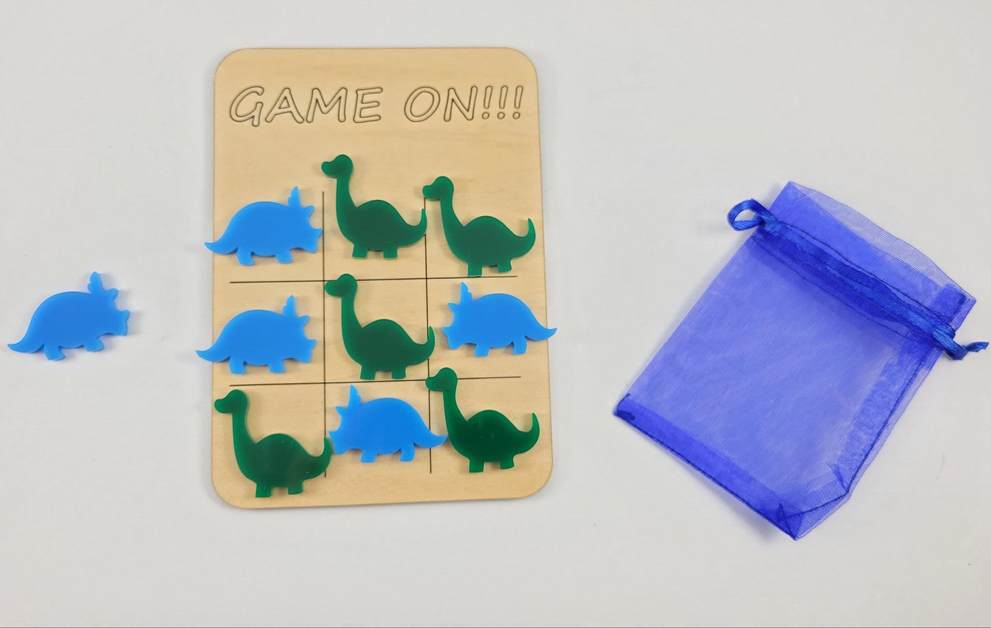 The boards are laser cut/engraved out of wood and the pieces are cut out of acrylic, to make them more durable. Each board comes with a little bag for the pieces.