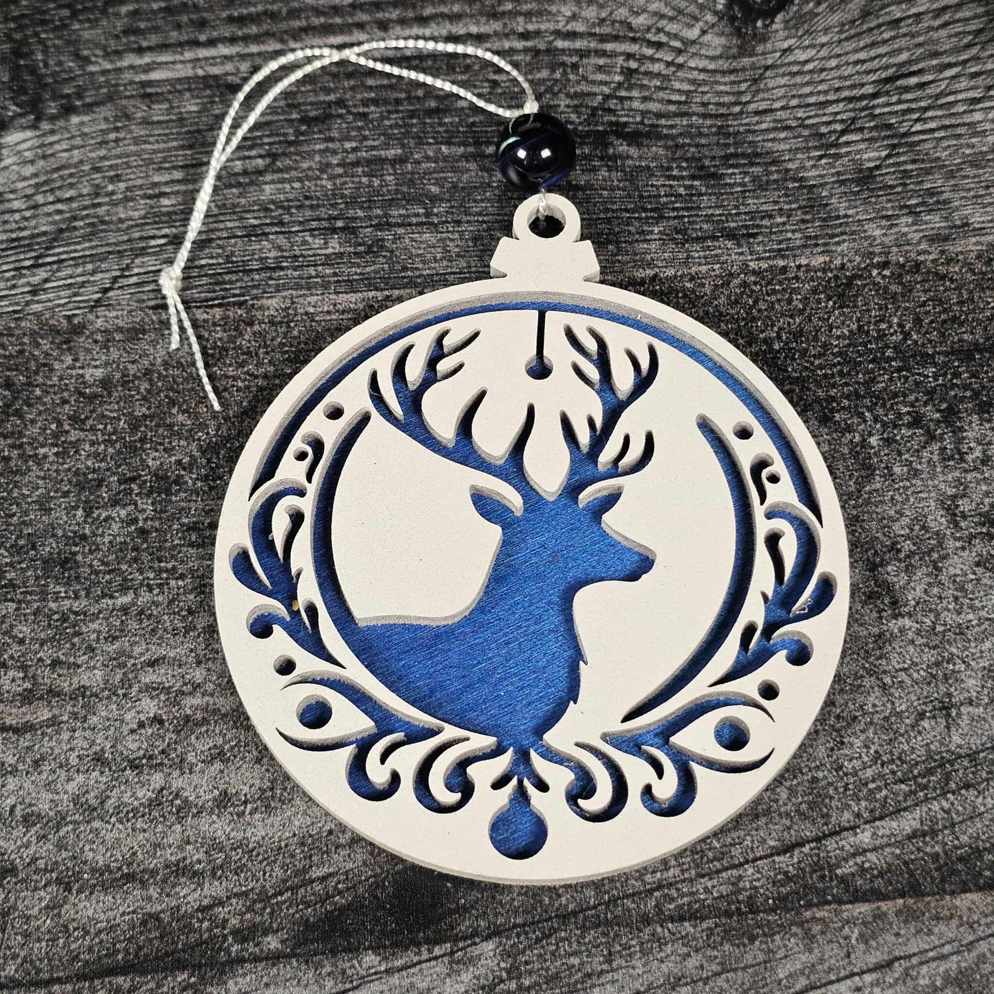 The top layer is painted a crisp white, showcasing an intricate deer silhouette surrounded by swirling designs. Beneath it, a navy blue bottom layer adds striking contrast and a rich wintery feel. Each piece is carefully hand-assembled, with a bead and sturdy white cord for easy hanging on your Christmas tree or garland.