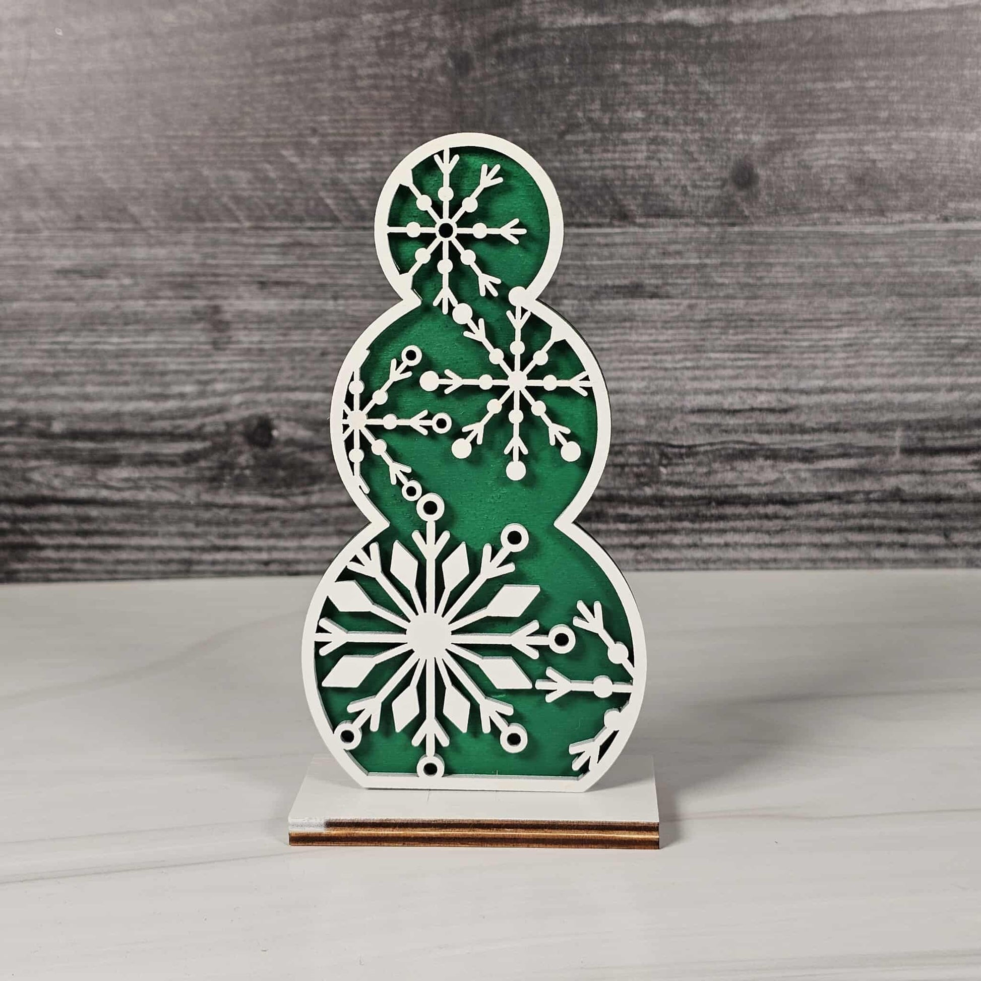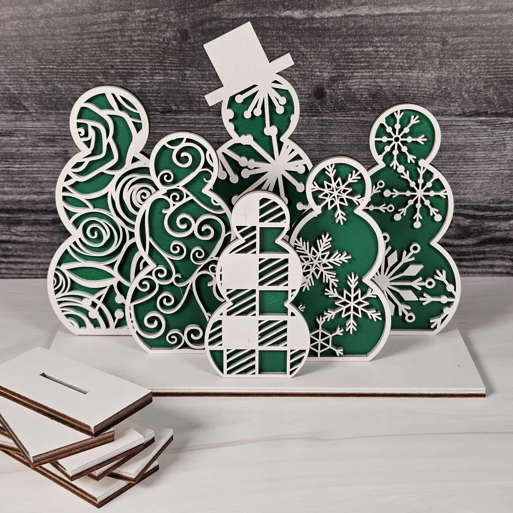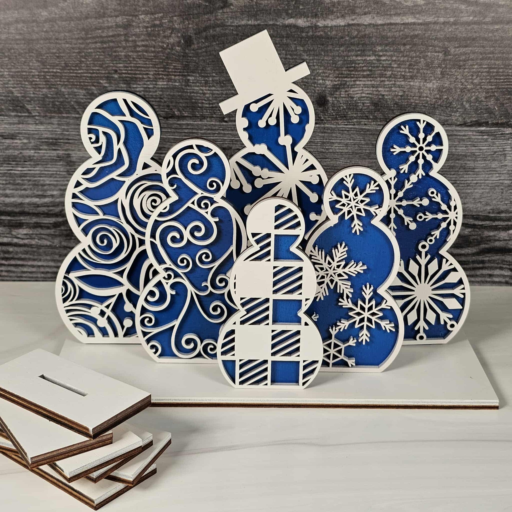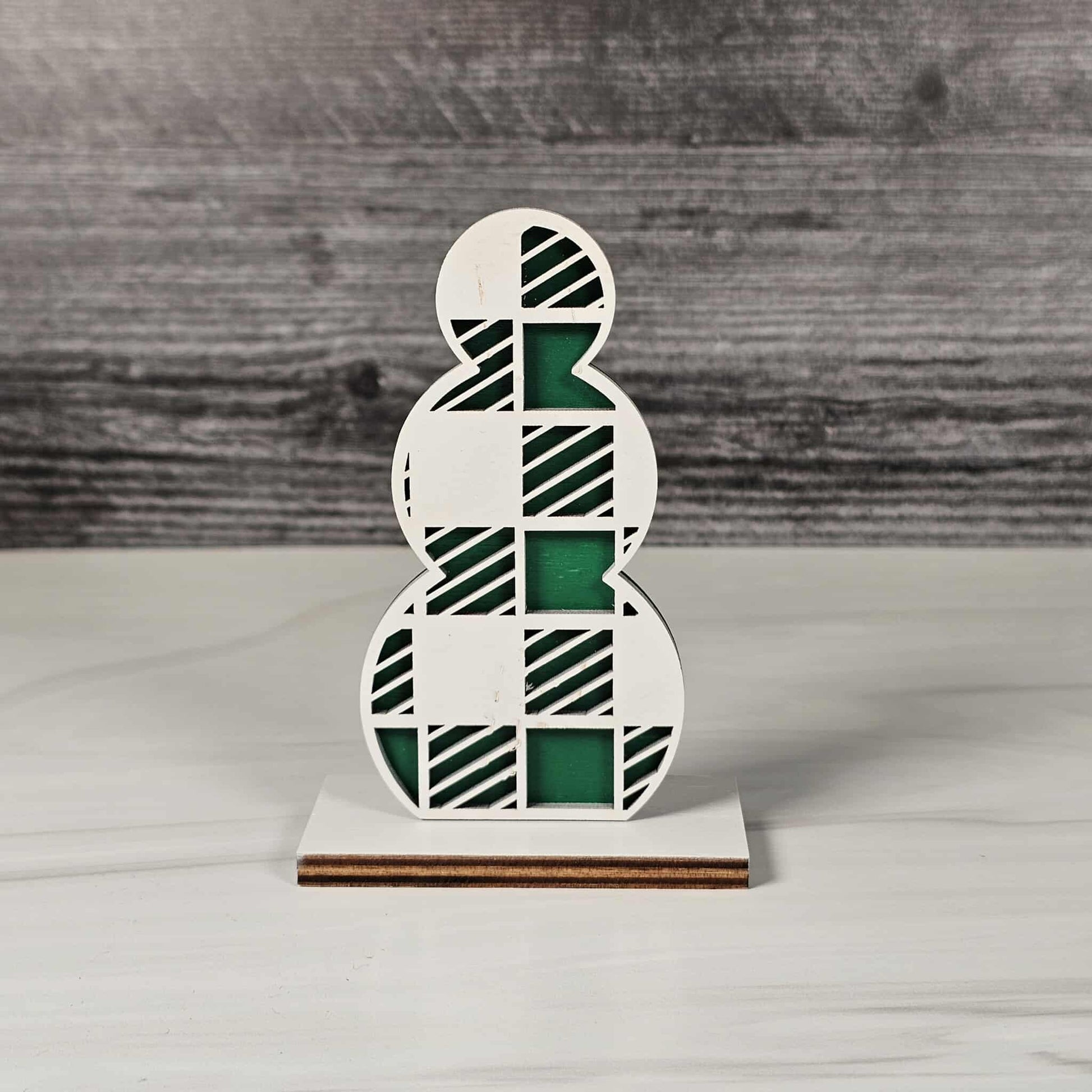 Bring the cozy magic of winter right into your home with our Snowmen Shelf Sitters! Lovingly crafted from laser-cut wood, each snowman is a double-layered delight: the base layer comes in your choice of festive red buffalo plaid, cheerful blue, or evergreen green, while the top layer is a crisp, snowy white, elegantly cut with seasonal patterns and delicate shapes for a heartwarming, wintery feel.