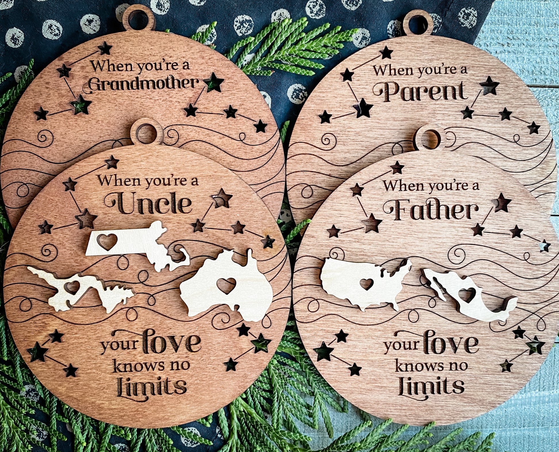 This ornament includes up to 4 shapes. The choices are: states, countries, houses, hearts, or stars. The hearts, stars and houses shapes have room to engrave names if you would like to personalize them. Please list your choices on the order note on the checkout page.