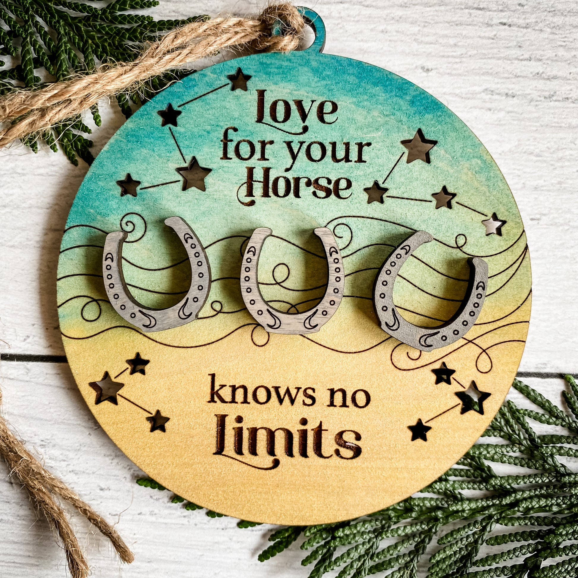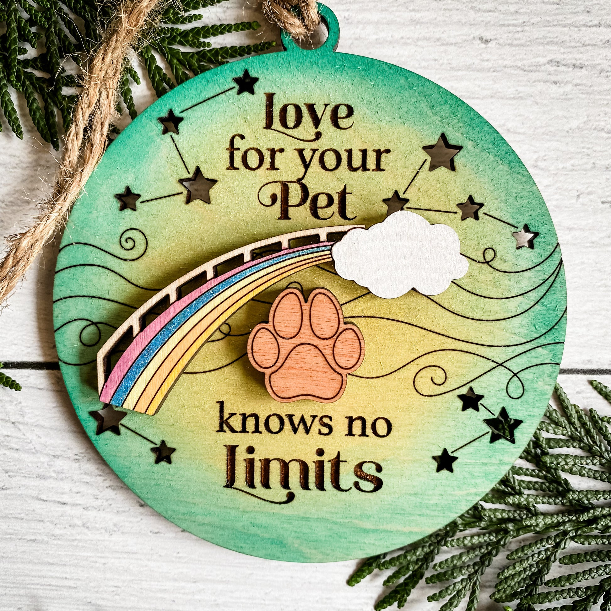 This ornament includes up to 4 shapes. The choices are: cat print, dog print, horse shoe, or rainbow road. The paw prints will be wood colored, the horse shoes silver, and the rainbow road rainbow colors. Please list your choices on the order note on the checkout page.